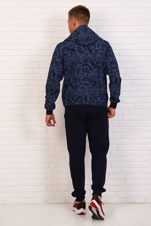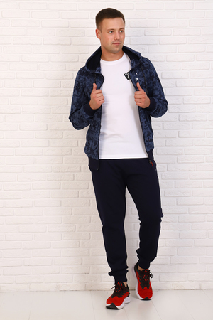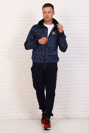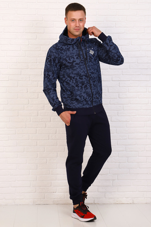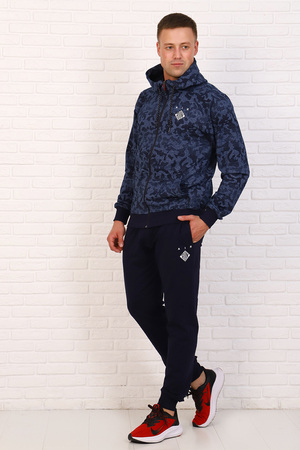 Эффектный и удобный мужской костюм. Олимпийка на молнии, карман-кенгуру, капюшон-стойка, рукав на манжете. На передней полочке небольшая печать. Брюки с карманами, низ на манжете. Под карманом с левой стороны небольшая печать.
