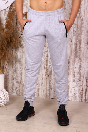 Брюки мужские с манжетами на резинке. Подходит для прогулок и для занятий спортом. Карманы на молнии, украшены декоративной лентой.