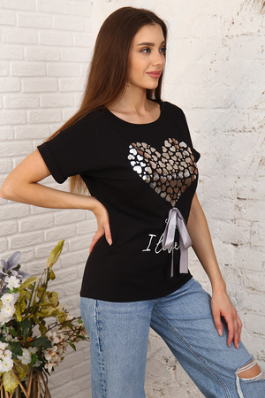 Футболка женская с современным принтом и бантом из атласной ленты, из кулирки с лайкрой высокого качества ПЕНЬЕ. Модель свободного покроя, вырез горловины в виде "лодочки", короткий цельнокроеный рукав обработан манжетом с отворотом. Футболка комфортная, отлично будет сочетаться с любым элементом гардероба, создаст уникальный и неповторимый образ модницы.