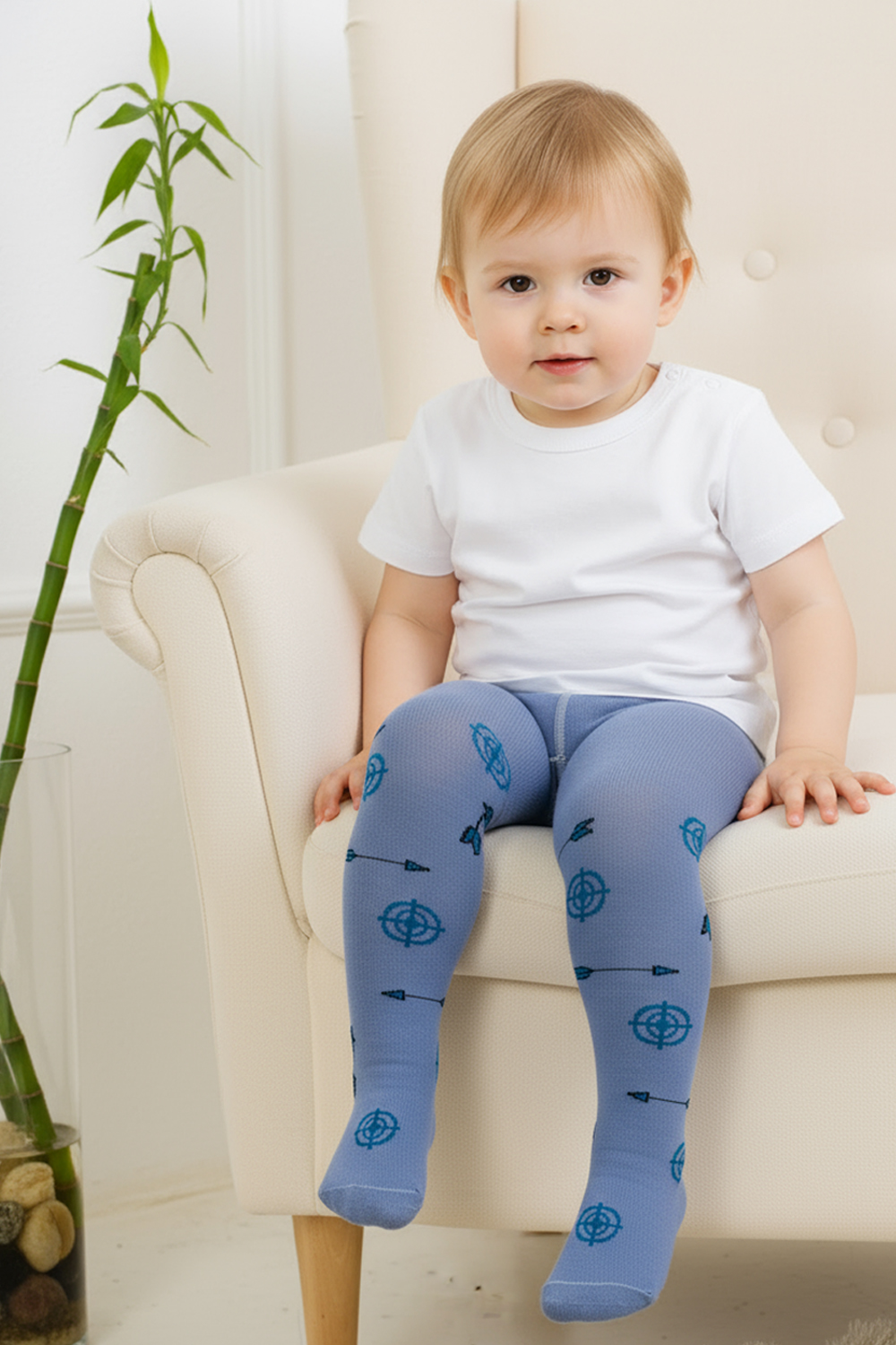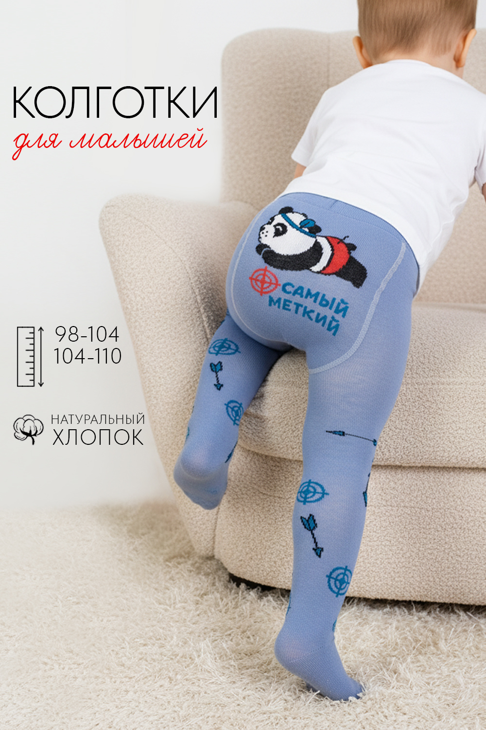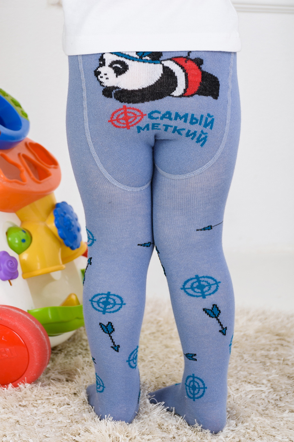 Детские колготки для мальчиков. По всей поверхности колготок вывязаны рисунки в виде стрел и мишеней, сзади - панда и надпись "Самый меткий"