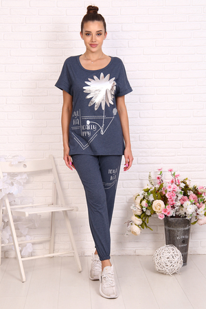 Костюм женский из кулирного полотна состоит из футболки и брюк. Футболка прямой силуэт, горловина круглая, спущенное плечо, рукав короткий, втачной с отворотом, низ обработан на плоскошовной машине, на полочке принт. Брюки прямые, верх на поясе с резинкой, в боковых швах карманы, низ брюк на резинке, на передней половине принт.
