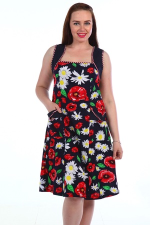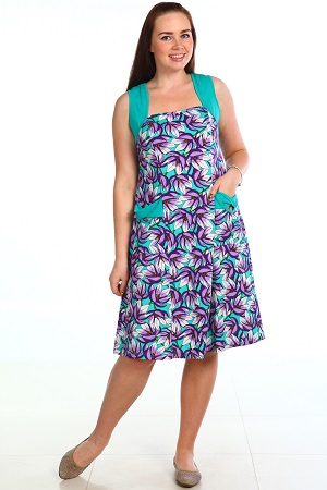 Легкий сарафан из кулирки. Цветные вставки на лямках и карманах, рукава отсутствуют, несколько вариантов расцветки, общая длина сарафана чуть ниже коленей.