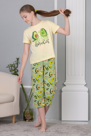 Уютная пижамка с оригинальным принтом "Авокэт". Свободная футболка со спущенной линией плеча, бриджи свободного кроя. Можно использовать как домашний костюм. Рекомендуется деликатная стирка.