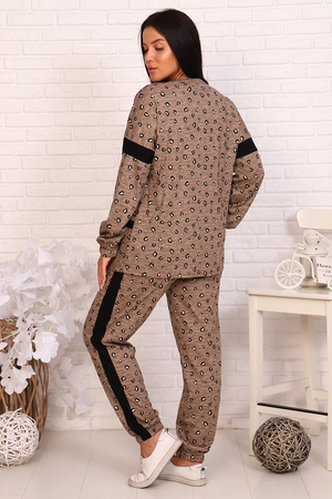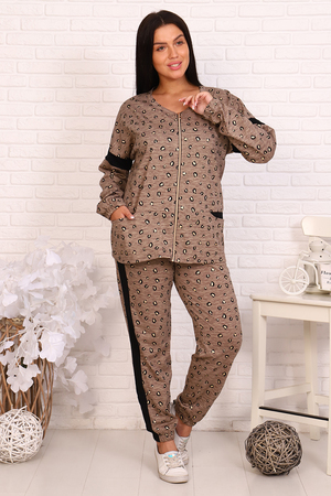Костюм женский из набивного кулирного полотна состоит из кофты и брюк. Кофта свободного кроя с карманами, застежка-молния, спущенное плечо, рукав длинный втачной со вставкой, низ рукава на резинке. Брюки с лампасами, верх на поясе с резинкой, низ брюк на резинке.