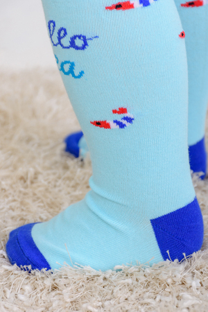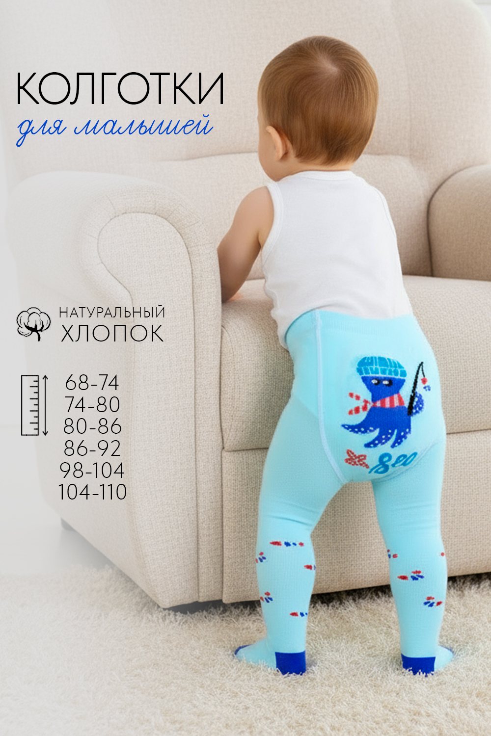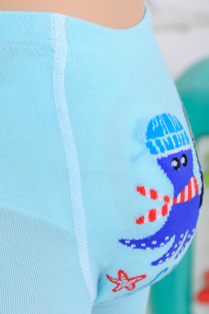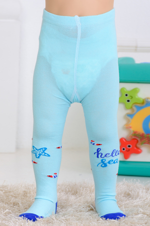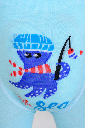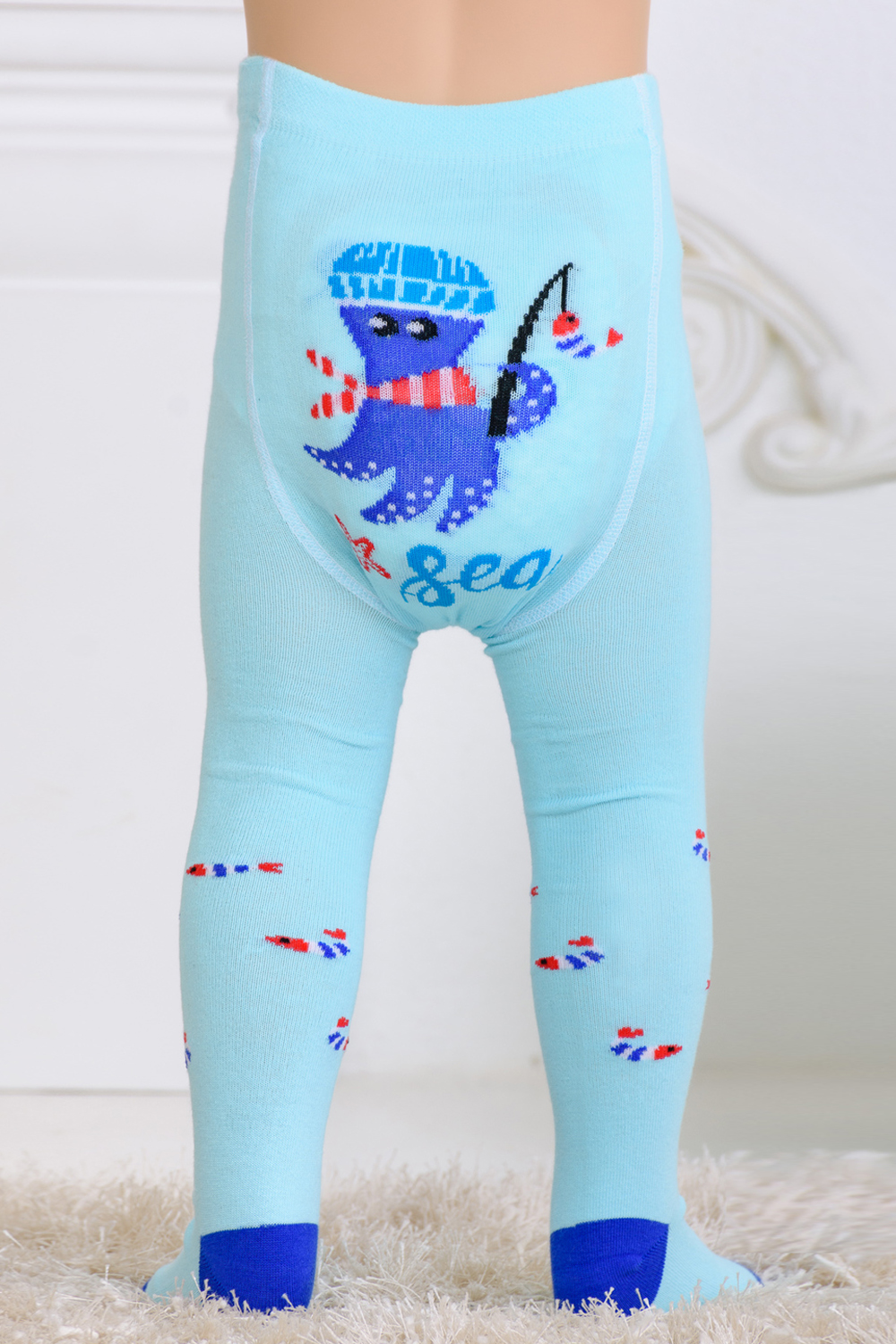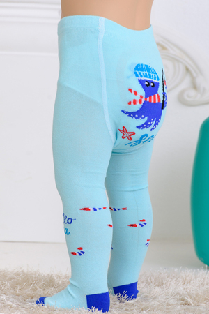 Детские колготки с рисунками. Спереди вывязаны морские звезды и надпись "Hello sea" ("Привет, море"), сзади вывязан веселый осьминог