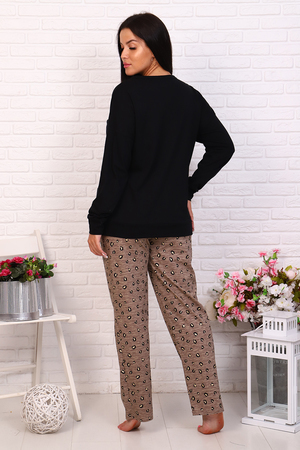 Костюм женский состоит из кофты и брюк, кофта прямой силуэт, горловина круглая, спущенное плечо, рукав длинный, втачной, внизу рукава манжет, низ кофты на поясе, на полочке принт. Брюки прямые, верх на поясе с резинкой, в боковых швах внутренние карманы, низ брюк обработан на плоскошовной машине.