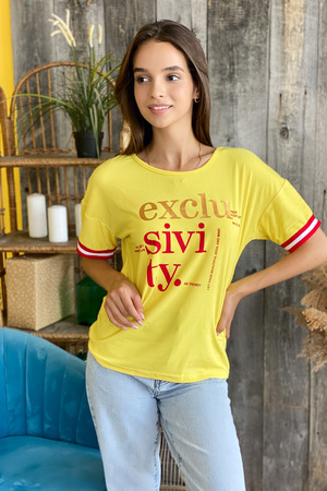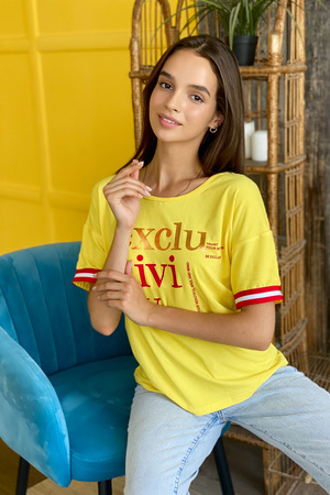 Футболка прямого силуэта, с округлой горловиной спереди, с удлиненной спинкой. Рукав короткий, обработанный декоративной тесьмой. В верхней части спинки обработан фигурный вырез с тесьмой. Горловина обработана бейкой из основного полотна.