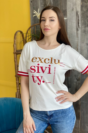 Футболка прямого силуэта, с округлой горловиной спереди, с удлиненной спинкой. Рукав короткий, обработанный декоративной тесьмой. В верхней части спинки обработан фигурный вырез с тесьмой. Горловина обработана бейкой из основного полотна.