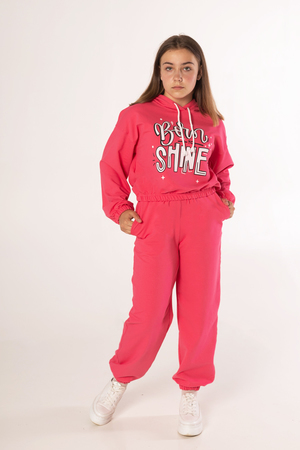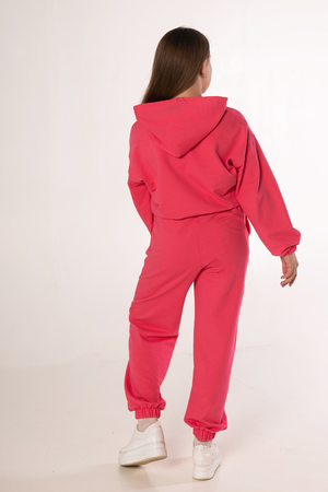Толстовка укороченная. Рукава со спущенной линией плеча и манжетами на резинке. Низ изделия на резинке. Капюшон со шнуром. Полочка декорирована принтом. Яркая модель в спортивном стиле идеально сочетается с брюками розового цвета артикул 1517.