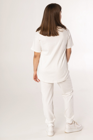 Футболка с округлённым и удлинённым низом со стороны спины. Полочка декорирована принтом. Ткань изделия состоит из 100% хлопка, что позволяет подростку чувствовать себя комфортно в любую погоду.