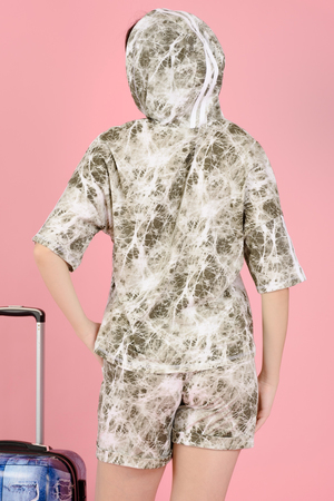 Футболка прямая, свободная, с капюшоном, с удлиненной спинкой. Рукав короткий, с лампасами вдоль рукава. По центральной вставке капюшона настрочены лампасы из отделочного полотна.