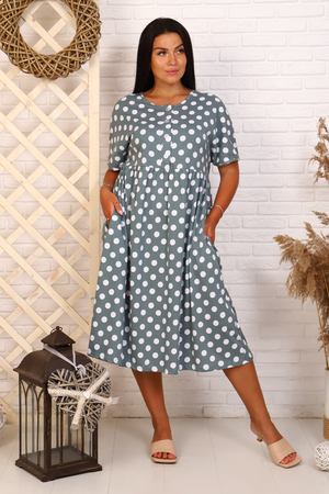 Как же хочется летом легких, воздушных, простых, но до бесконечности притягательных нарядов. Длина ниже колена подчеркивает стройность ног. Отрезное по талии, но не приталенное. Летом в тренде свобода движения и естественность. При необходимости образ можно дополнить ремешком, сделав акцент на талии. Планка с декоративными пуговицами добавит образу фактуры. Два незаметных, но удобных кармана в боковых швах. Платье демократично в сочетаниях с обувью. Для чувственного утонченного образа - босоножки на каблуке, модные кроссовки или кеды - на каждый день. Россыпь горошка привносит свое очарование и поднимает настроение.