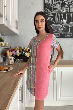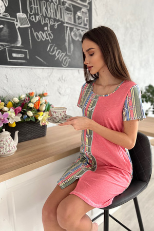 Халат на молнии, полуприлегающего силуэта, длиной выше колена, с округлой горловиной, с карманами в боковом шве, с фигурной линией низа. Рукав втачной, короткий. Горловина обработана бейкой из основного полотна.