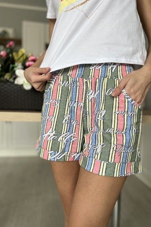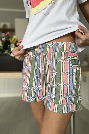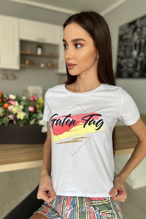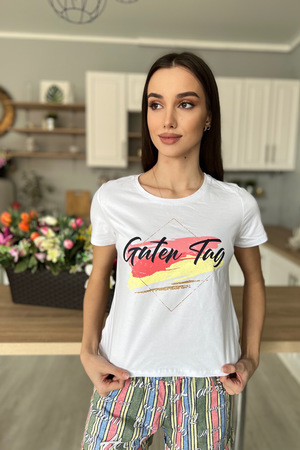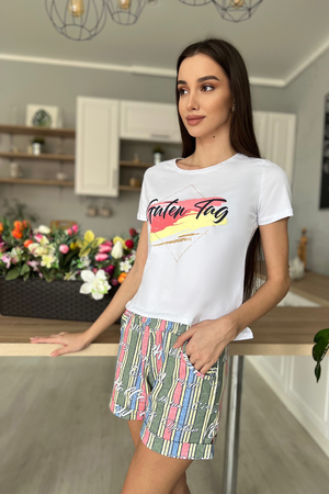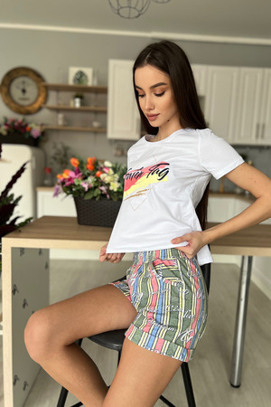 Костюм состоит из футболки и шорт. Футболка прямого силуэта, с удлиненной спинкой, с округлой горловиной. Рукав втачной, короткий. В нижней части боковых швов обработаны разрезы. Горловина обработана обтачкой из основного полотна. Шорты прямые, на поясе, с карманами, с манжетом по низу.