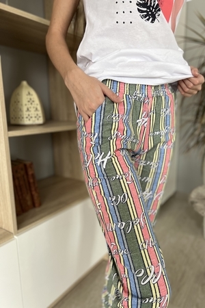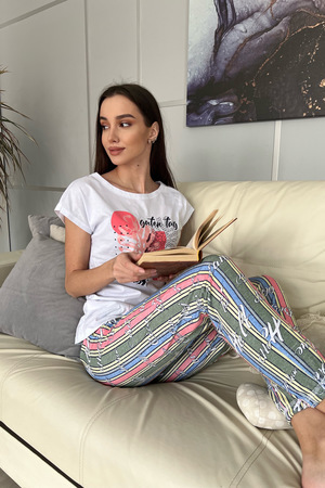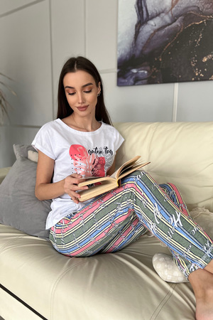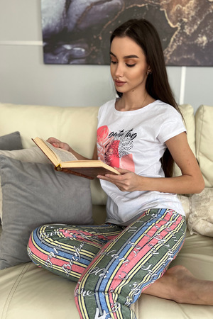 Комплект состоит из футболки и брюк. Брюки свободные, длинные, с карманами, на эластичном поясе, с резинкой по низу. Футболка полуприлегающего силуэта, с округлой горловиной, длиной до середины бедра. Рукав втачной короткий. В верхней части спинки обработан декоративный вырез. Горловина, низ рукавов и вырез на спинке обработаны бейкой из основного полотна с отделочным кантом.