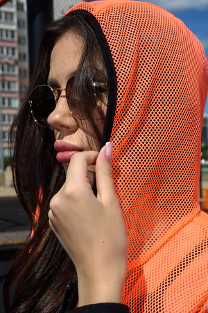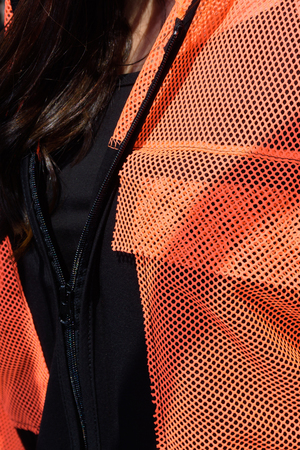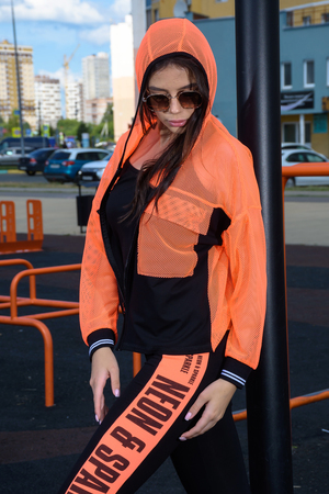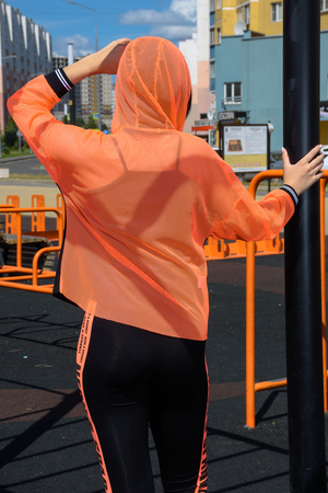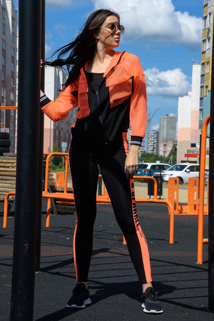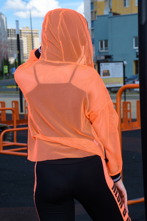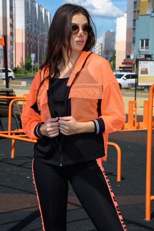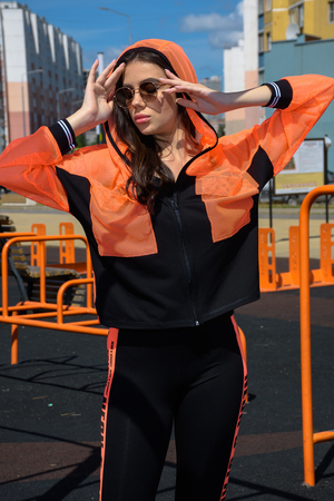 Комплект состоит из толстовки и майки. Толстовка прямая, свободная, с капюшоном из сетки, на молнии. Рукав длинный, из сетки, на эластичном манжете. Спинка удлиненная, из сетки. В верхней части полочки расположены кокетки из сетки. На полочку настрочены накладные карманы с клапанами из сетки. Майка на бретелях, полуприлегающая.