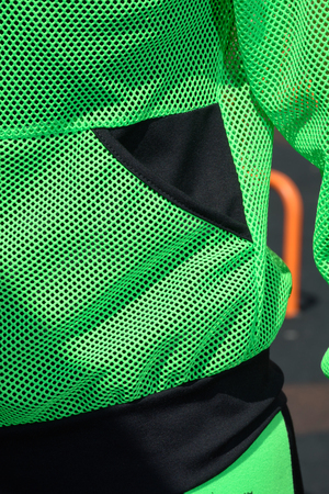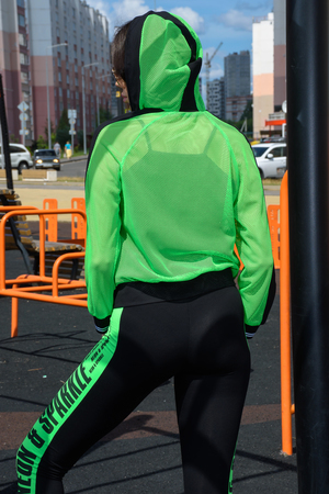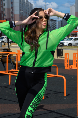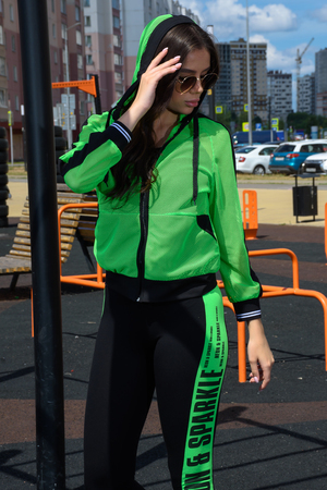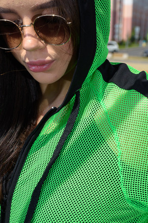 Толстовка с капюшоном из сетки, длиной до середины бедра. Рукав реглан длинный, из сетки, с контрастным лампасом вдоль рукава, на эластичном манжете. На полочке расположены фигурные карманы из сетки.
