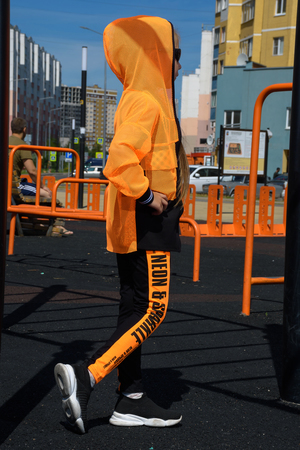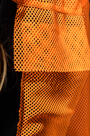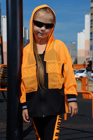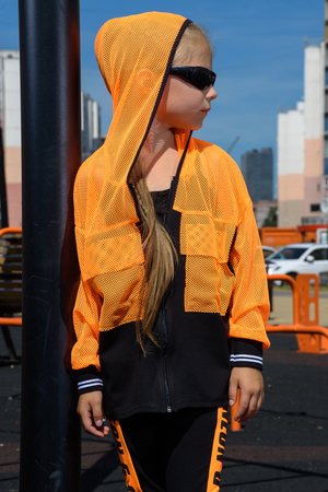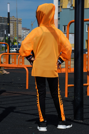 Толстовка прямая, свободная, с капюшоном из сетки, на молнии. Рукав длинный, из сетки, на эластичном манжете. Спинка удлиненная, из сетки. В верхней части полочки расположены кокетки из сетки. На полочку настрочены накладные карманы с клапанами из сетки.