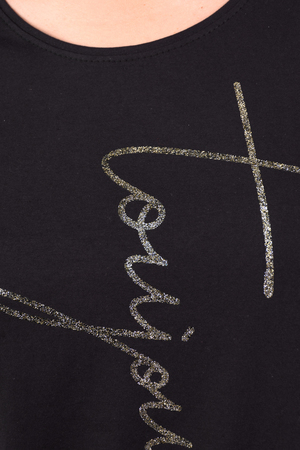 Стильная женская футболка с принтом из серебристого и золотого глиттера. Спокойные цвета ткани. Горловина обработана двойным кантом. Рукава и низ изделия подогнуты.