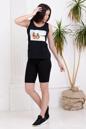 Модная женская майка из трикотажного полотна. С широкими лямками и круглой горловиной. На изделии имеется яркая печать и стразы.