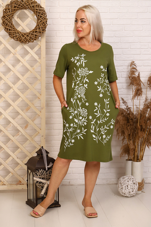 Платье полуприлегающего силуэта с короткими рукавами и двумя карманами в боковых швах. На полочке принт.