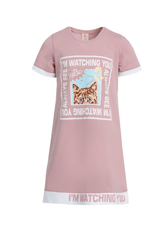 Платье из легкой хлопковой ткани, расклешенное книзу. Рукав втачной, короткий. Низа рукавов и платья отделаны обтачками из ткани контрастного цвета, горловина обтачкой из основной ткани. Полочку украшает шелкография.