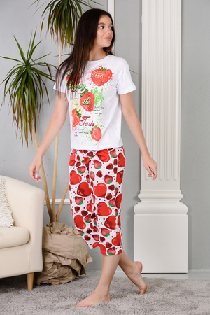 Уютная "клубничная" пижамка. Футболка со спущенной линией плеча, бриджи свободного кроя. В этой пижаме удобно спать, проводить время дома и на отдыхе.