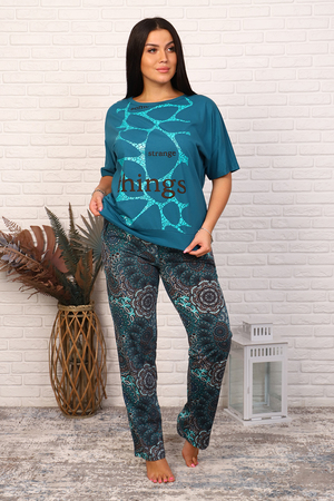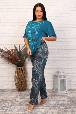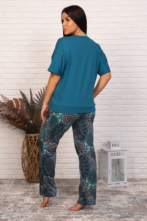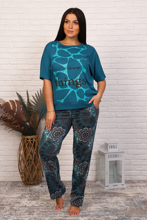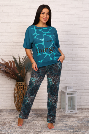 Костюм женский из кулирного полотна состоит из кофты и брюк. Кофта свободного кроя, горловина круглая, спущенное плечо, низ изделия на поясе, на полочке принт. Брюки прямого кроя, верх на поясе с резинкой, в боковых швах внутренние карманы, низ изделия обработан на плоскошовной машине.
