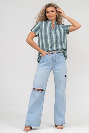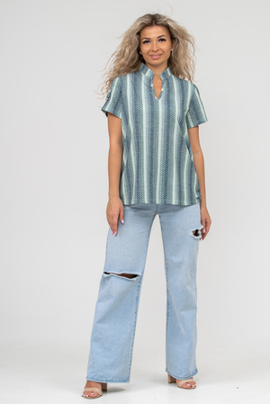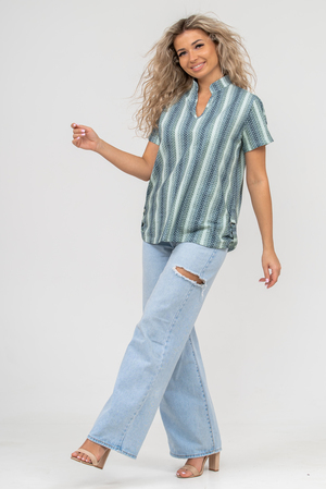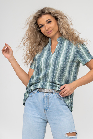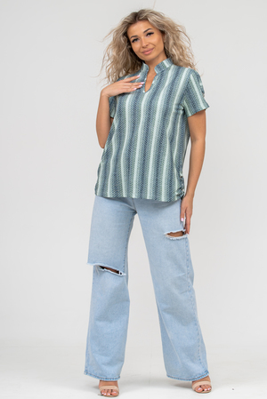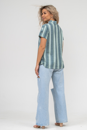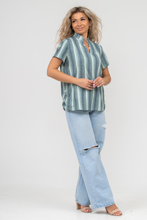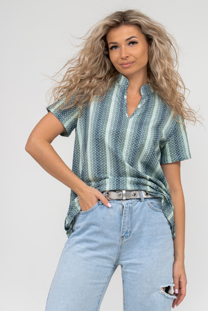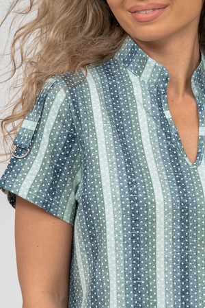 Женская туника-рубашка из 100% хлопчатобумажного полотна, сочетающая в себе всеми любимую полоску и не выходящий из моды горошек. Горловина с V - образным вырезом и воротником стойкой. Рукав и низ изделия с отделкой в виде полуколец, что делает тунику более привлекательной и по-своему красивой.