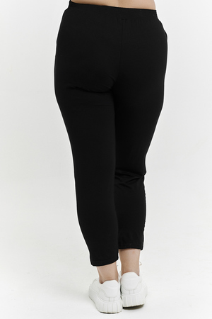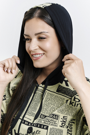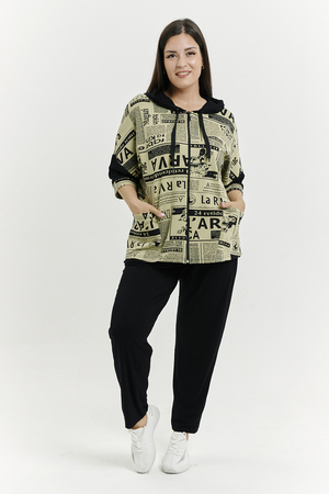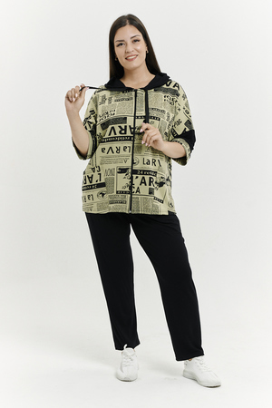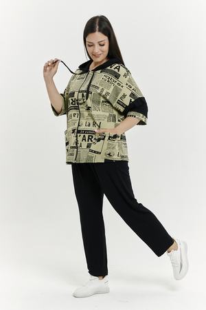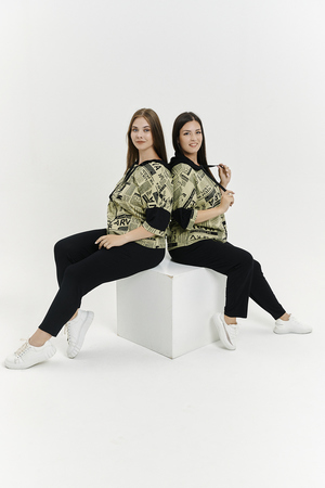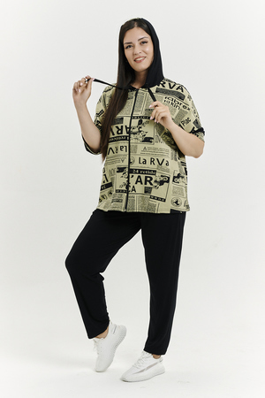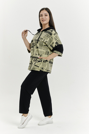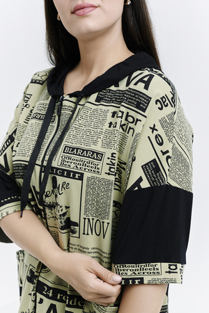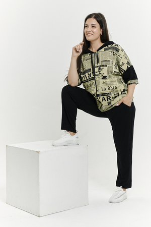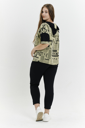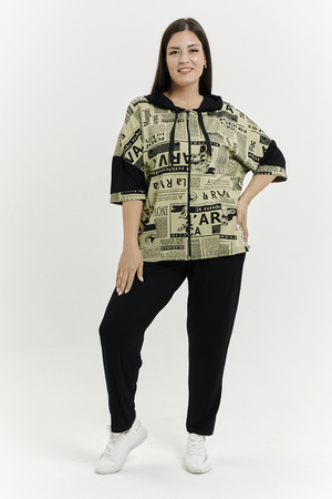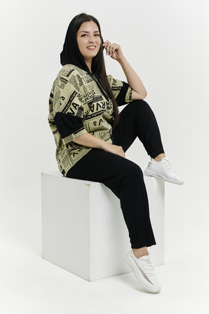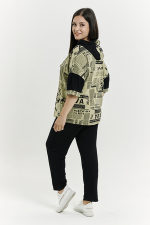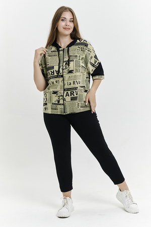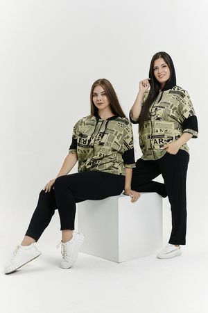 Костюм состоит из толстовки и брюк. Толстовка прямая, расширенная, с капюшоном, на молнии. Рукав короткий, на манжете. На полочке расположены фигурные накладные карманы. Брюки на поясе, с боковыми карманами. В верхней части передних половинок по шву притачивания пояса расположены складки.