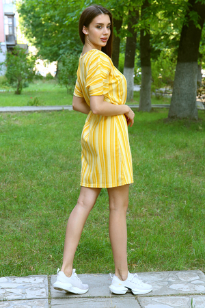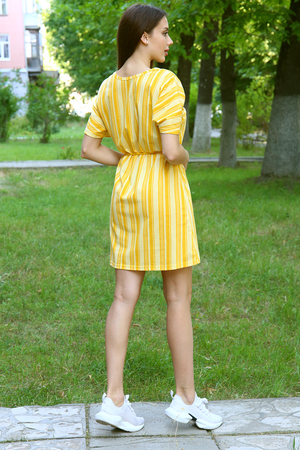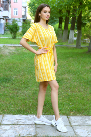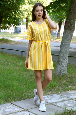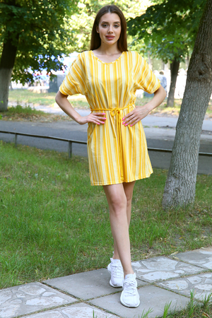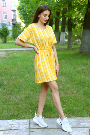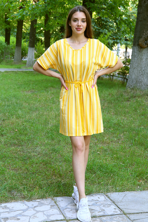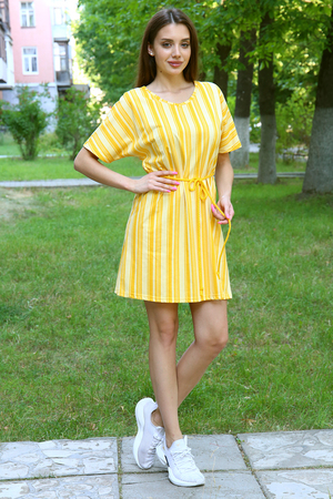 Яркая молодежная туника силуэта "летучая мышь" из ткани в полоску, средняя длина, пояс на шнурке