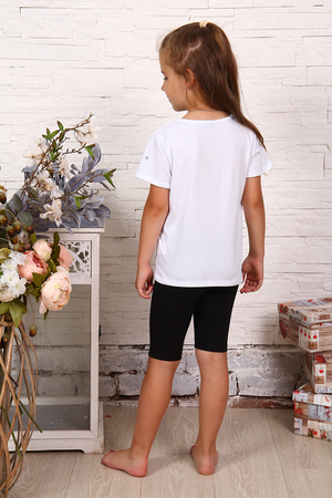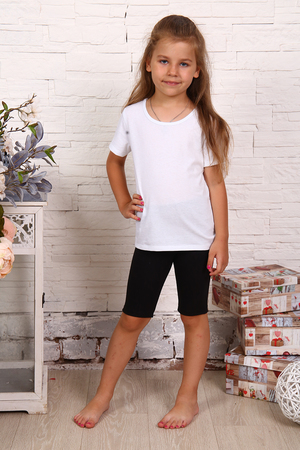 Костюм детский для занятий в спортивных секциях и физкультурой для девочки, футболка и велосипедки. Футболка полуприлегающего силуэта с коротким рукавом. Горловина округлой формы, обработана окантовкой. Низ изделия и рукавов подогнут. Велосипедки прилегающего силуэта с цельнокроенным поясом, низ подогнут.