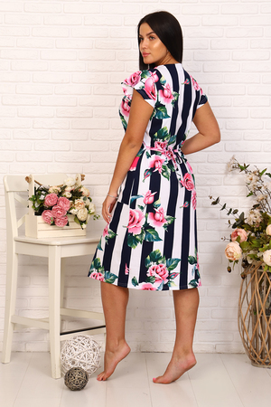 Оригинальный женский халат с красивым принтом на ткани в виде полос и роз. Рукав короткий в форме крылышка, отложной треугольный воротник. Застежка-молния, длина ниже колена.