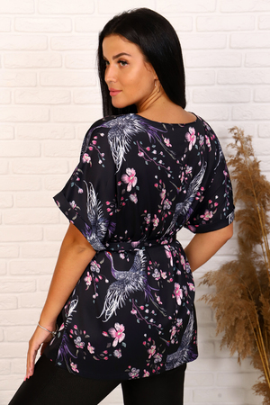 Элегантная женская футболка с ярким принтом журавли на темном фоне выполнена из приятного к телу материала. Цельнокроеный короткий рукав с загибом, округлый вырез горловины и свободный крой футболки делают ее универсальной частью женского гардероба. Изюминка данного изделия - пояс, который выгодно подчеркнет линию талии. Модель создаст неповторимый женственный образ, отлично подойдет как для деловых встреч, так и для неформальных вечерних выходов.