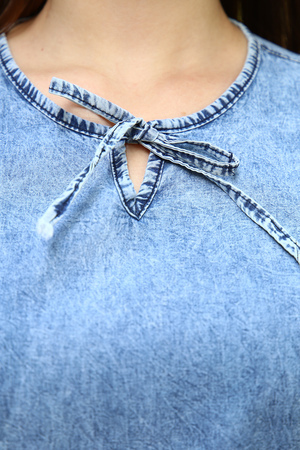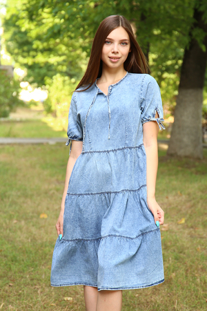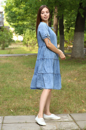 Платье женское свободного силуэта с коротким рукавом, с двумя боковыми карманами, с круглым вырезом горловины. Горловина и рукава на завязках. Длина ниже колена.