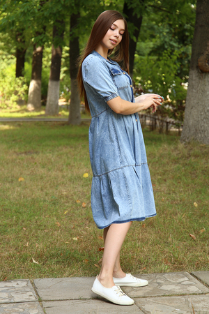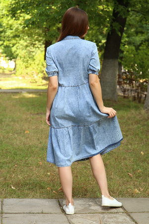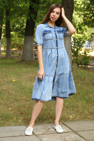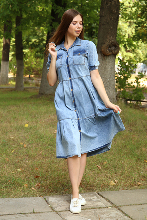 Платье женское полуприлегающего силуэта с воротником. С двумя накладными карманами на груди. Рукава короткие на манжете. Длина изделия ниже колена.