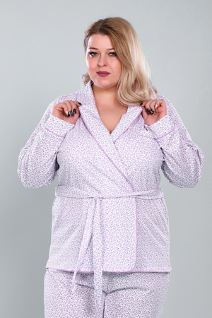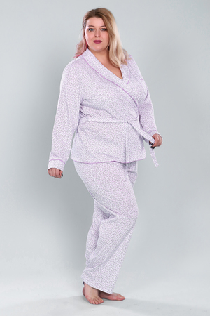 Пижама женская. Жакет прямой на запах. По борту и низу изделия отделочный кант. Кант на манжете рукава и на кармане. Воротник «шалька». На передней левой полочке карман накладной с кругленными краями и манжетом. Рукав втачной прямой, длинный, с притачным манжетом. На кармане, на манжете и по воротнику с бортом отделочный кант контрастного цвета. На жакете пояс. Для пояса на жакете имеются шлевки. Брюки прямые, свободные - не зауженные к низу. Низ прямой. Верх брюк на вшивной резинке 3 см