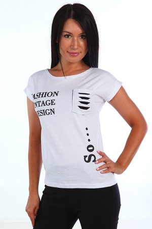 Элегантная женская футболка из кулирки. Две расцветки — белая и черная. Принт в виде надписей, спереди декоративный карман с разрезами. Размеры от 40 до 52. Имеется возможность розничного заказа.