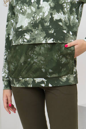 Модная толстовка выполнена из футера с дизайном тай - дай. На капюшоне и кармане присутствует отделка из сетки. На спинке толстовки белая модная надпись, которая сопровождает современную одежду и помогает нам создать индиввидуальность и образ в целом. Данную модель можно приобрести с брюками - костюмом 36516.