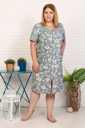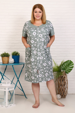 Большие размеры! Легкий, красивый халат на молнии, выполнен из 100% хлопка. Передняя полочка имеет декоративную кокетку, рукав обработан манжетом, карман изделия обработан обтачкой. Идеально сядет на любую фигуру