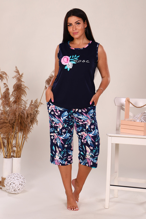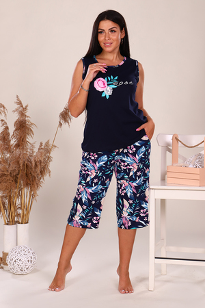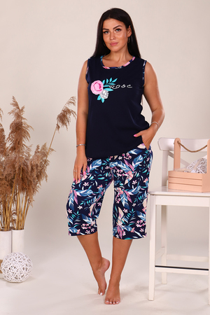 Яркий домашний костюм. Майка средней длины с яркой печатью, окантовка горловина, рукав. Бриджи прямого кроя, к низу чуть заужены, с карманами.