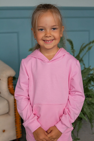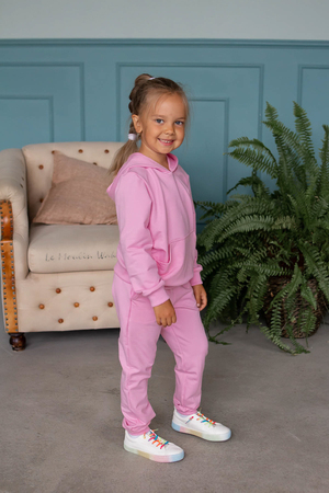 Костюм для девочек дошкольного и младшего школьного возраста. Костюм состоит из толстовки и штанов. Костюм из трикотажного эластичного хлопкового однотонного полотна футер. Толстовка с капюшоном, с длинным рукавом на манжете и поясе из основного полотна. На переде толстовки расположен карман-кенгуру. Штаны с боковыми карманами, на манжетах и поясе из основного полотна.