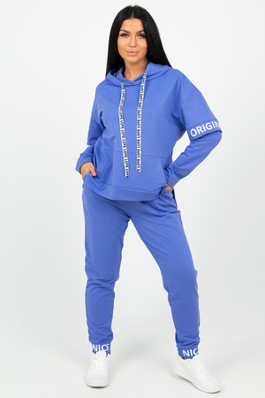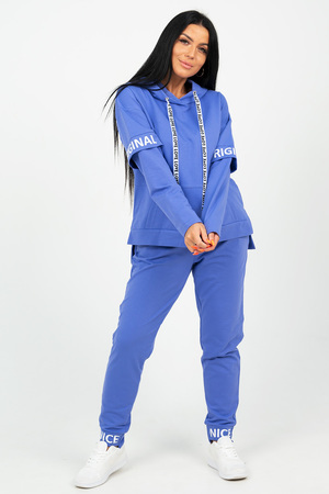 Молодежный костюм из футера 2-х нитки. Худи с длинным рукавом и с капюшоном, спереди накладной карман "кенгуру", низ разноуровневый, по бокам разрезы. Брюки заужены к низу, на манжетах, по бокам внутренние карманы, пояс на резинке. На рукавах и манжетах брюк печать.