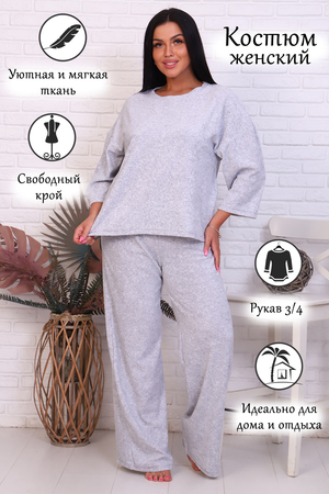 Костюм женский махровый - кофта и брюки. Кофта полуприлегающего силуэта, с втачным рукавом 3/4. Горловина округлой формы, обработана стойкой. Низ изделия и рукавов подогнут. Брюки расширенного силуэта с широким цельнокроеным поясом, низ подогнут.