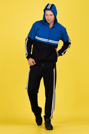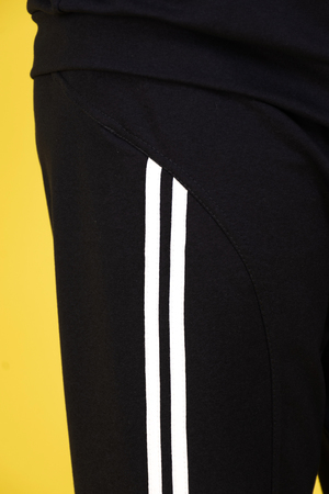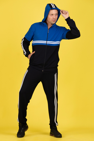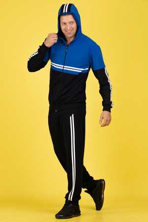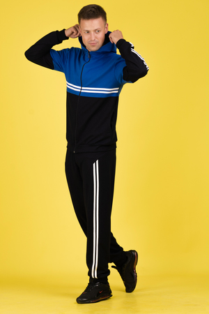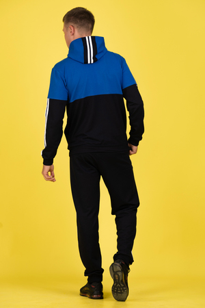 Спортивный костюм с лампасами отлично подойдет для спорта и отдыха. Кофта с капюшоном и боковыми карманами.