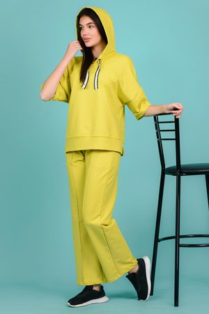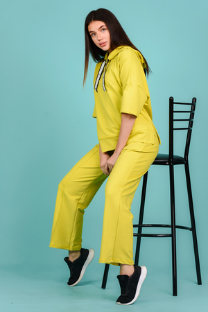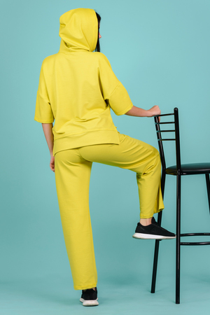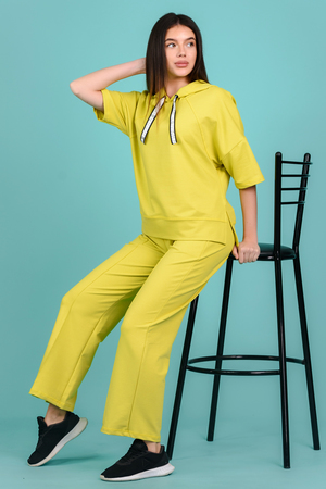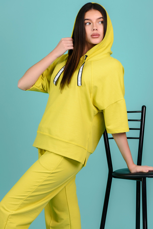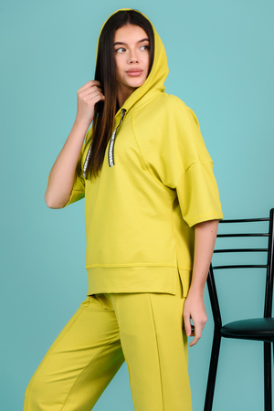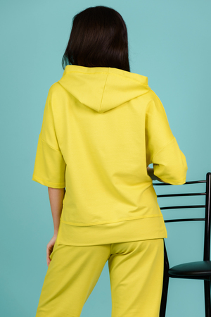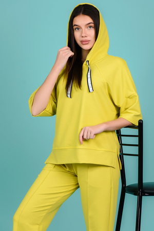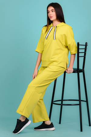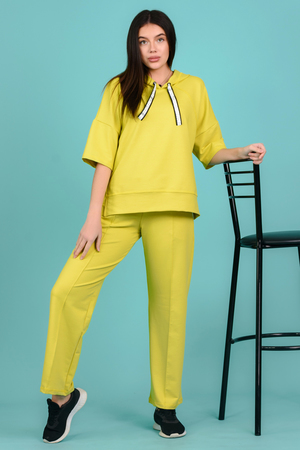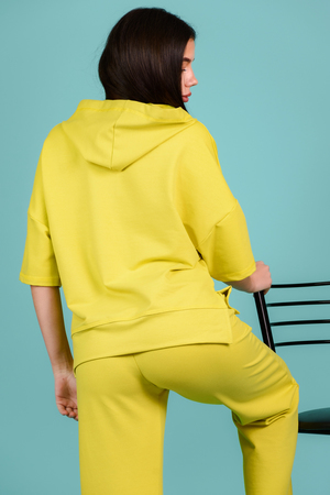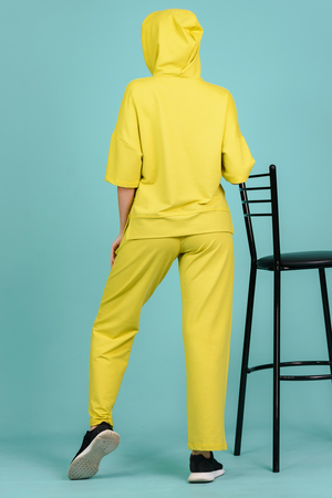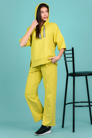 Костюм состоит из толстовки и брюк. Толстовка прямая, свободная, с капюшоном, с коротким рукавом. На полочке расположены симметричные фигурные кокетки. В нижней части боковых швов обработаны разрезы. Низ полочки и спинки завершены поясом. Брюки свободные, прямые, со стрелками, с карманами, на поясе.