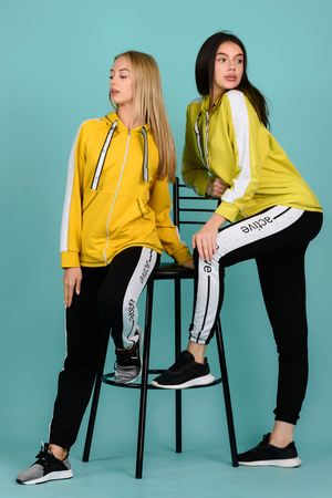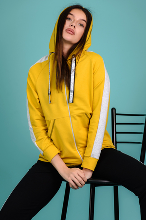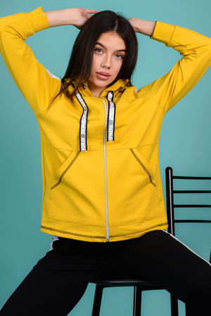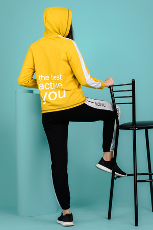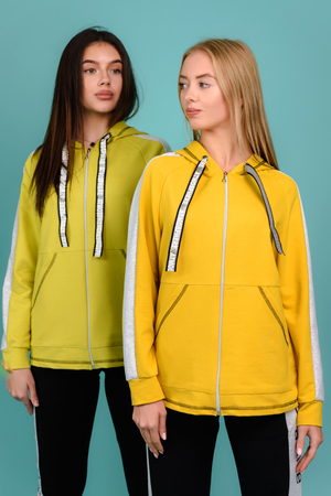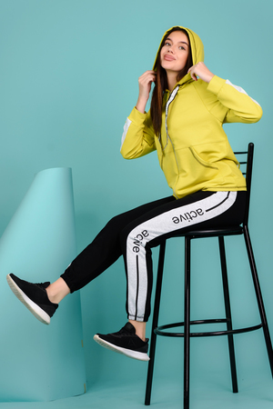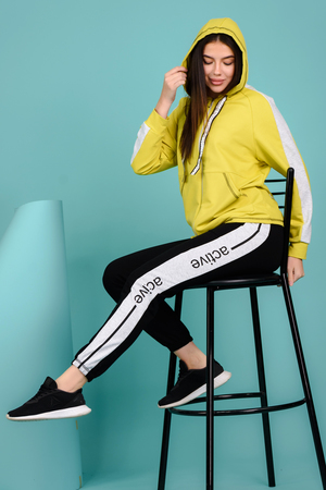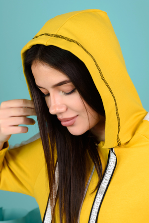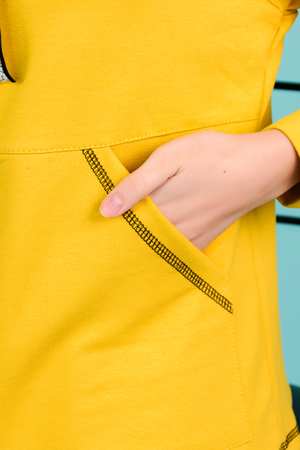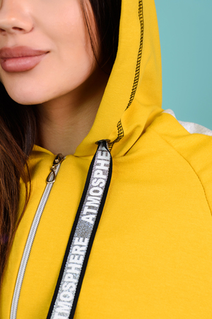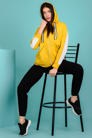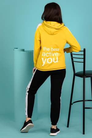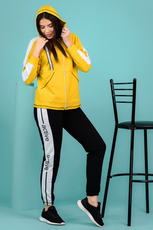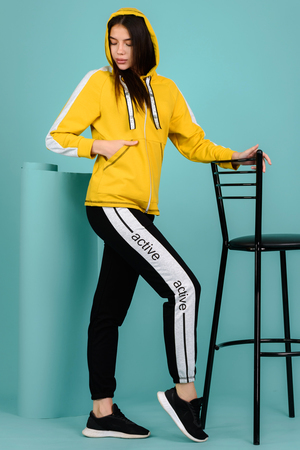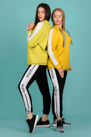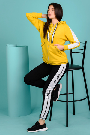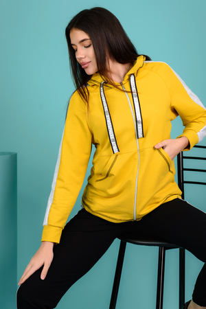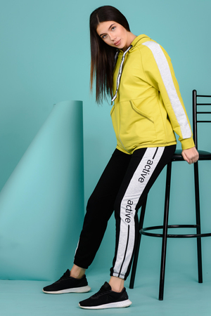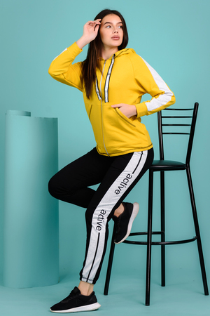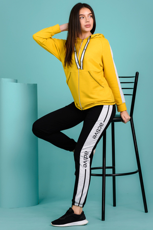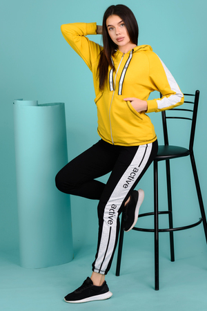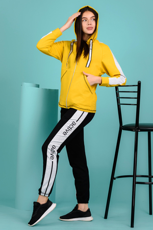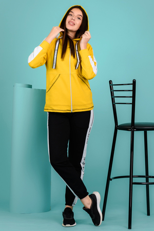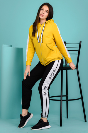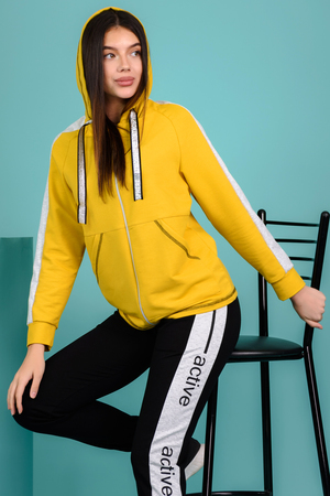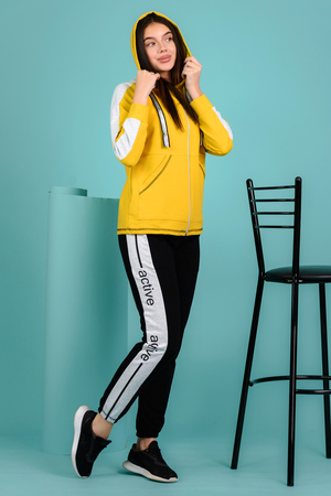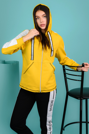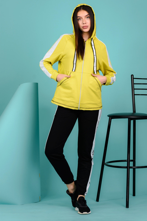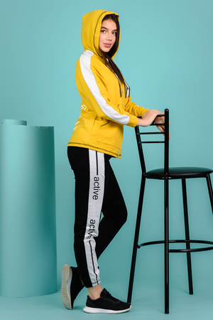 Костюм состоит из толстовки и брюк. Брюки на поясе, с боковыми карманами, с лампасами из отделочного полотна по боковым швам, на резинке по низу. Толстовка прямая, на молнии, с капюшоном, с карманами "кенгуру", длиной до середины бедра. Рукав реглан, длинный, с лампасами из отделочного полотна вдоль рукава, на манжете.