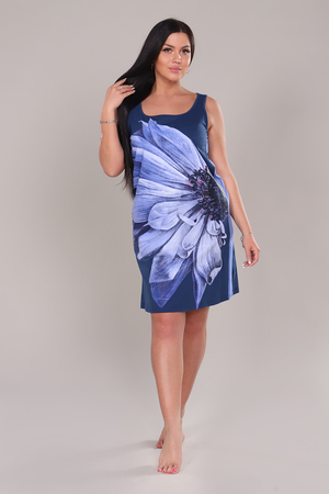 Женская сорочка на широких лямках, с квадратным окантованным вырезом, контрастные вставки по бокам. На изделии на передней полочке расположен большой изящный цветок. Низ подогнут.