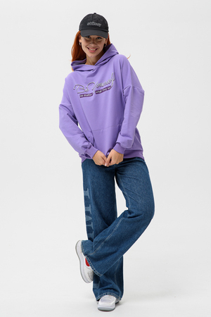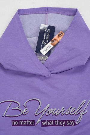 Фиолетовая мода. Слегка удлинённая толстовка в спортивном стиле с карманом кенгуру и капюшоном. Изделие выполнено из футера без начёса. Перевод текста:"Будь самим собой и не важно что о тебе говорят." Линия плеча спущена, рукава удлинённые. В измерениях длина рукава указана от шва втачивания капюшона. Манжеты и низ толстовки обработаны плотной резинкой кашкорсе.