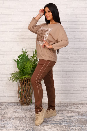 Женский трикотажный костюм, выполненный из футера 2х-нитки с лайкрой, состоящий из худи и брюк. Худи украшена оригинальным, привлекательным принтом на груди, по низу вставлен декоративный плоский шнурок. Рукав 7/8. Брюки с карманами и высокой посадкой на резинке, по бокам лампасы контрастного цвета. Костюм удобен практичен и гармонично смотрится в повседневной жизни.